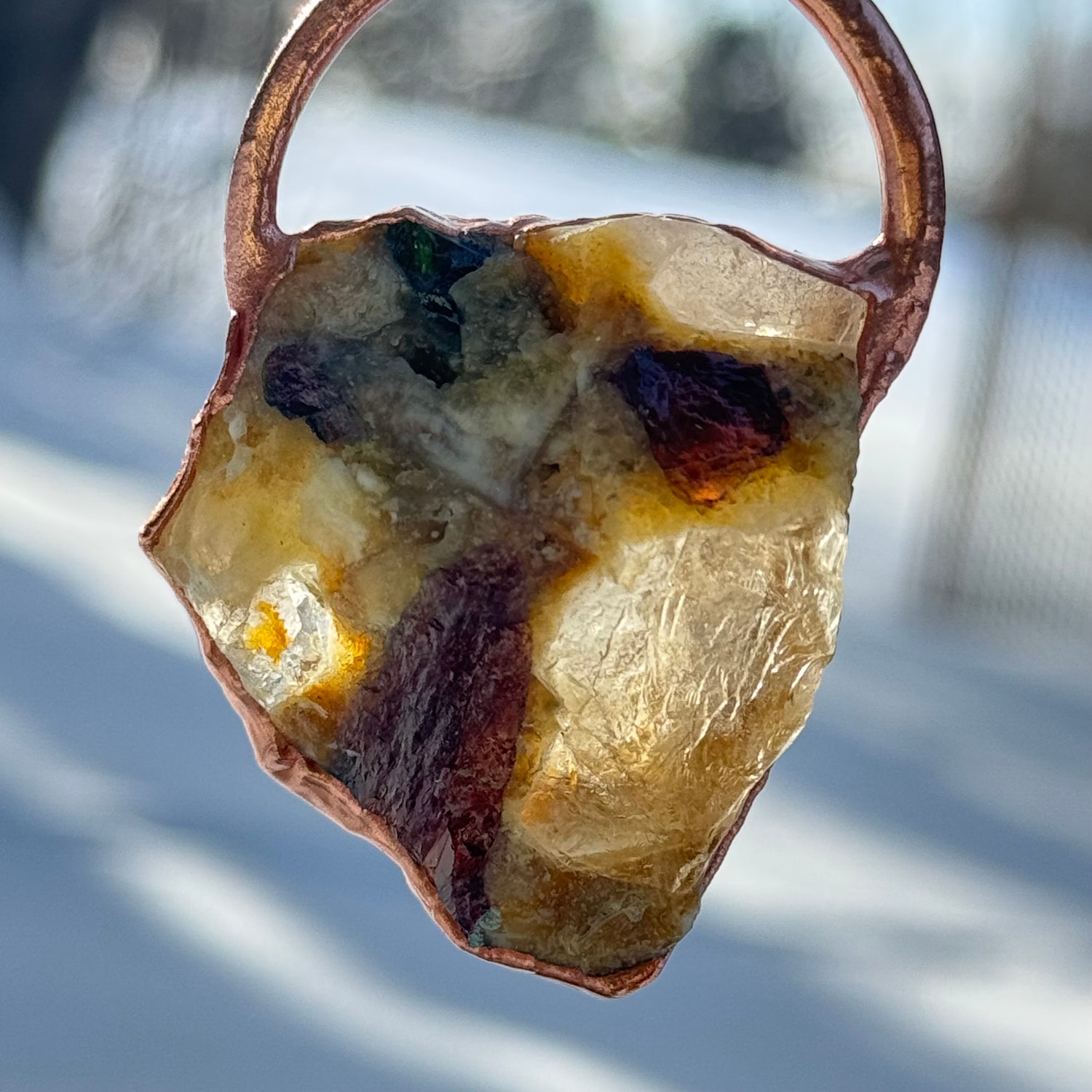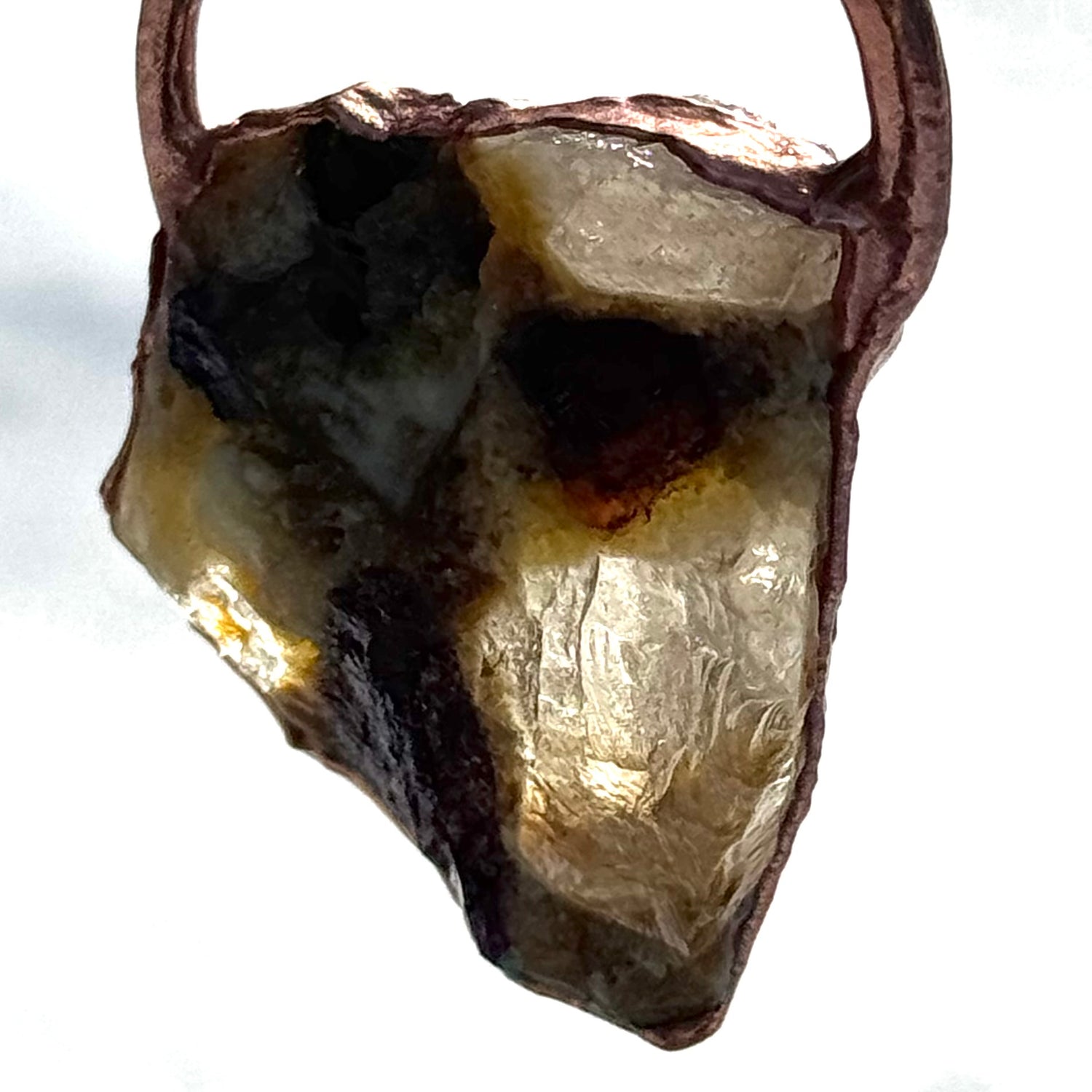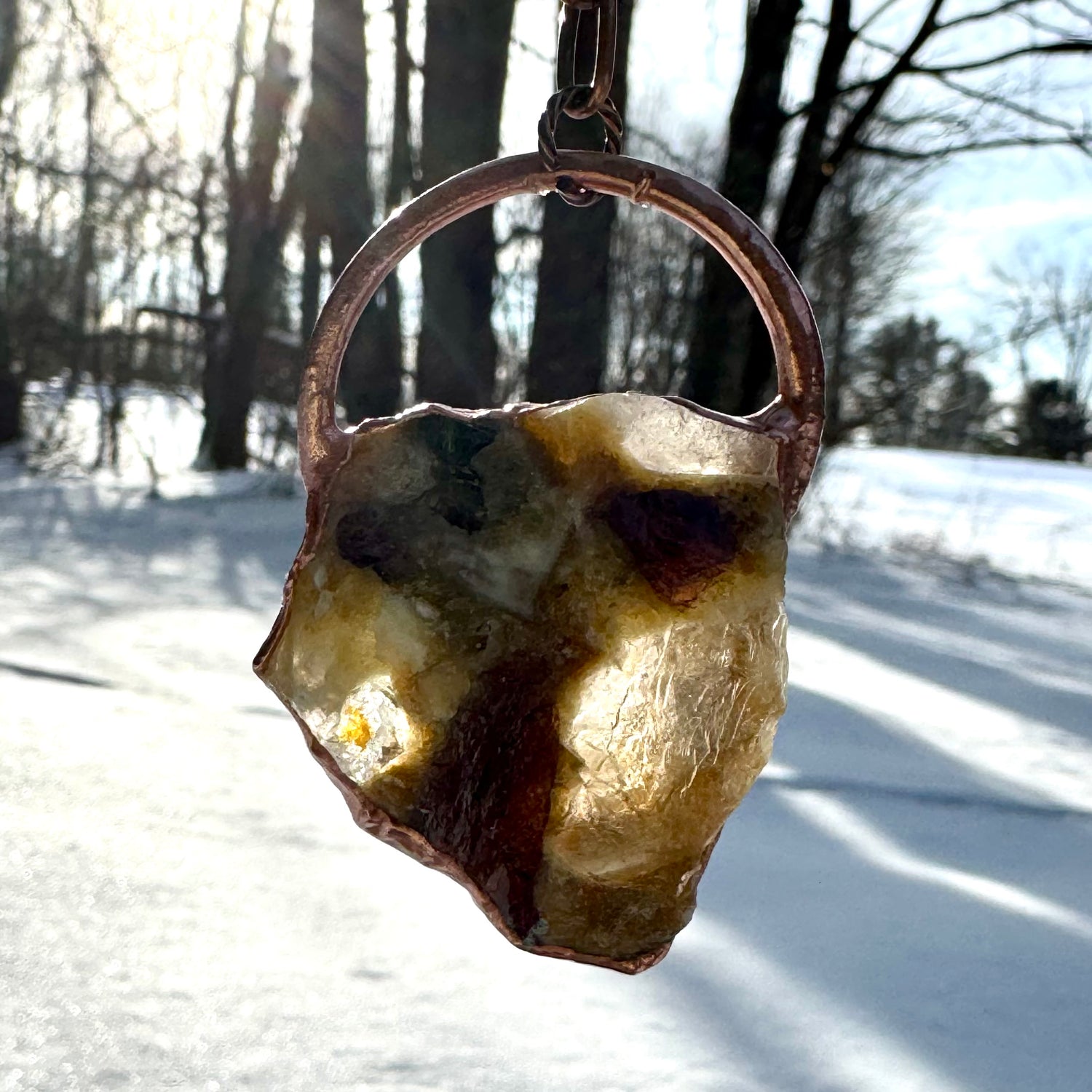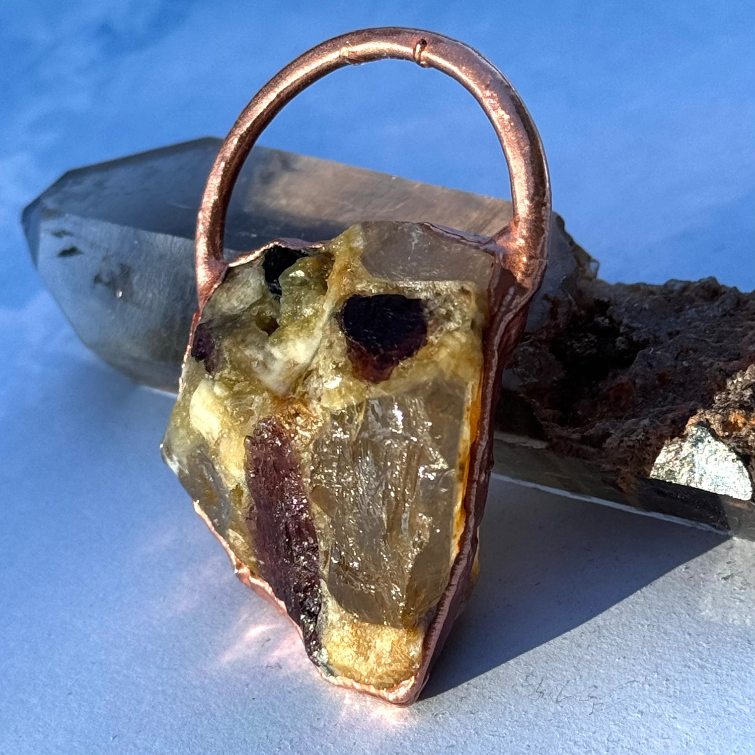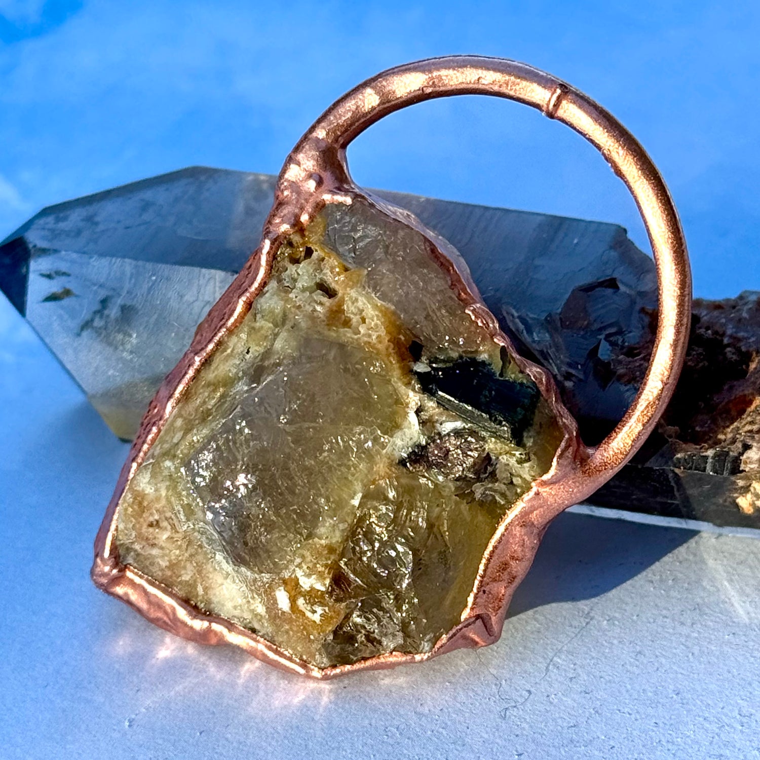 Handmade electrofomed crystal necklace styled to let the chunky, raw Tourmaline natural stone take center stage. This specimen was hand selected for its quality, size, and color, while its Brazilian energy emits a warm, loving vibe. The copper necklace has an adjustable lobster clasp, giving the wearer more creativity with the length, adjusting according to a neckline or other necklaces, making it versatile and meaningful.